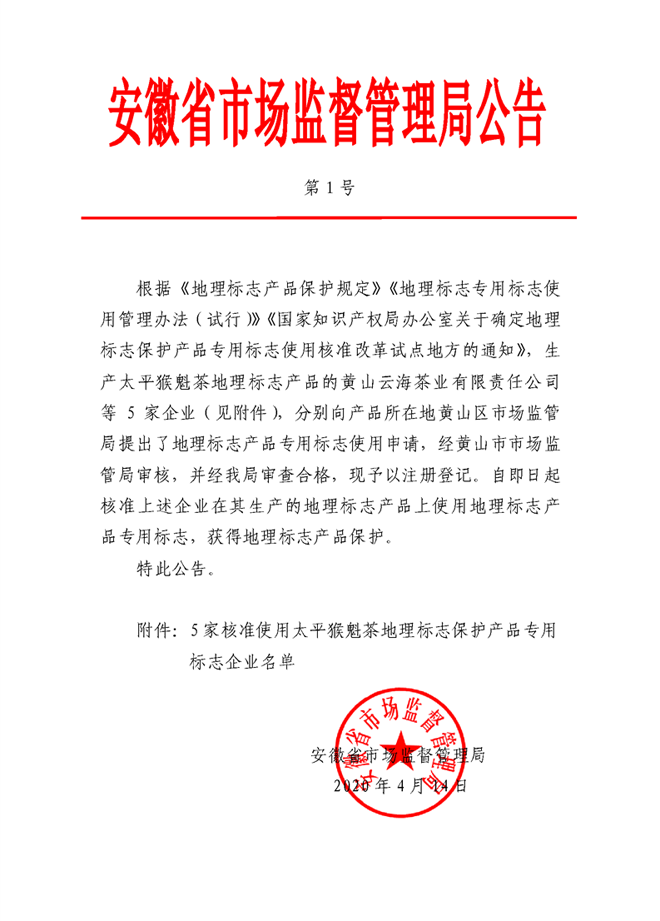 根据《地理标志产品保护规定》 《地理标志专用标志使用管理办法(试行》《国家知识产权局办公室关于确定地理标志保护产品专用标志使用核准改革试点地方的通知》,生产太平猴魁茶地理标志产品的黄山云海茶业有限责任公司等5家企业(见附件),分别向产品所在地黄山区市场监管局提出了地理标志产品专用标志使用申请,经黄山市市场监管局审核,并经我局审查合格,现子以注册登记。自即日起核准上述企业在其生产的地理标志产品上使用地理标志产品专用标志,获得地理标志产品保护。
