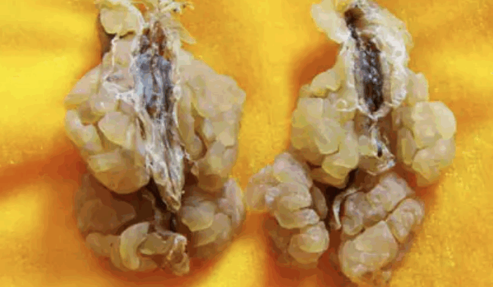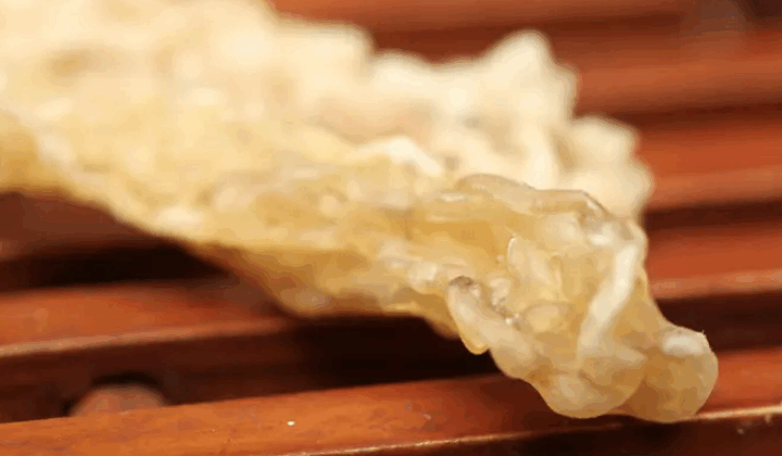 | 品质特征 | “安图林蛙”商品雌蛙输卵管的干燥物。三年生雌蛙油重(g)1.10+0.35油重/体重(g/g)0.1425+0.0373ab(失水95%状态)。油体弯曲而重叠呈不规则块状,长2cm-5cm,厚1.5mm-5mm,脂肪样光泽,表面偶带有灰白色或灰黑色,可见明显红色毛细血管,灰白薄状干皮,手摸有滑腻感,质硬易折断。用40℃左右温水浸泡,体积可膨胀10~15倍。液态油质乳白,触之脂感。块状在含潮20%状态下呈黄色或淡黄半透明状;无潮干品呈黄色或土黄色,蜡质明显的半透状。气腥,味微甘,嚼之有黏滑感。 |