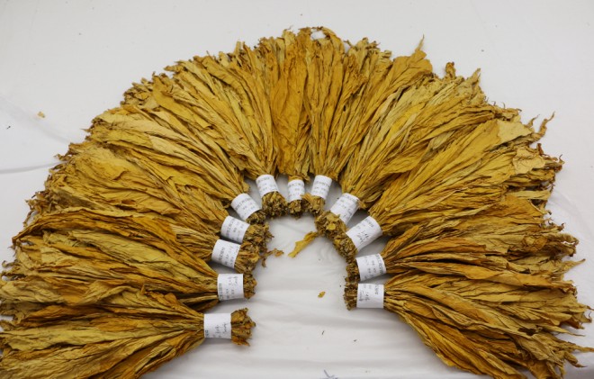 绑烟与装烤技术要求:鲜烟初分:烟叶采收后,先进行鲜烟分类,分为正常成熟、成熟度略高、成熟度略低、病虫为害等特殊烟叶四类。 限叶绑竿:密集式烤房,烟叶3片一束,1.45m长的烟竿,每竿50束、约150片;应使用蔴绳、棉线等植物纤维作为绑烟材料;杜绝采用橡胶、塑料等化学物质材料用于绑烟。 挂竿、装烤:装烤前要分类统计出总竿数,确定每层所装竿数,要求同层均匀,上下疏密一致,成熟度好的烟叶装中层,成熟度差的烟叶装上层,过熟叶装下层,观察窗周围要装有代表性的烟叶。上部、含水量少的烟叶,气候干旱的情况下,应适当装密,烘烤时有利于保湿变黄;中、下部叶,含水分多的叶,下雨天采收的烟叶,应适当装稀,有利于排湿。