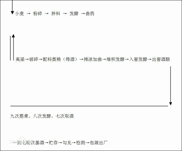 ⑨八次发酵:清蒸下沙一次,混蒸糙沙一次,熟糟上甑烤酒六个轮次循环过程中有六次封窖发酵,每加曲入窖发酵一个月,共八次发酵。