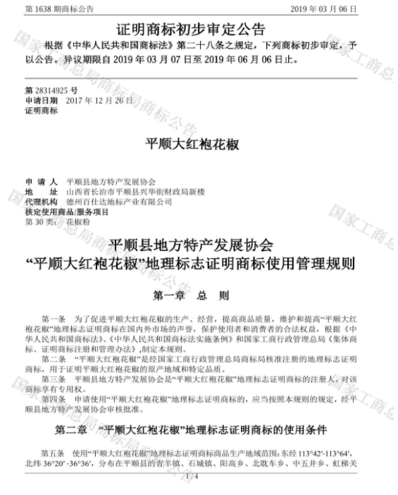 商标局地理标志证明商标公告2019年3月6日