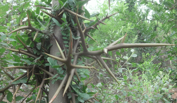 品质特征 | 嵩县皂角刺枝刺粗壮,分布均匀,1年生枝上枝刺30个~40个,枝刺间距3cm,刺长6cm~10cm,刺径0.5cm~1.0cm;枝刺常1~2回分枝,分枝刺1个~8个,圆锥状,红棕色或黄褐色。多年生枝上着生的枝刺多而大,刺长10㎝~27cm;单枝棘刺重15.6g,丰产性突出。坡旱地3年生单株年产刺0.3kg,4年生单株产刺0.5kg,5年生单株产刺0.7kg,6年生单株产刺0.9kg~1.5kg;植株健壮,树体生长旺盛,萌芽率、成枝力高,枝条分布均匀,树冠圆满。坡旱地6年生基径8.3cm~11.7cm,一年生枝发枝量53枝~60枝,平均长130cm以上,平均粗度1.0cm左右;顶端优势不明显,分枝角度75~83度,树形开张,易于达到丰产;主干直,灰褐色;为一回偶数羽状复叶,叶片革质,深绿色。小叶一般3~12对;小叶卵圆形,较大,长2cm~6cm,宽1cm~3.5cm;展叶期4月16日~17日,刺褐变期为7月上旬即开始,落叶期10月25日~11月5日;对土壤和气候条件要求不严,抗旱、耐寒、高耐贫瘠,较抗病虫害,具有更广泛的适应性和推广价值。 |