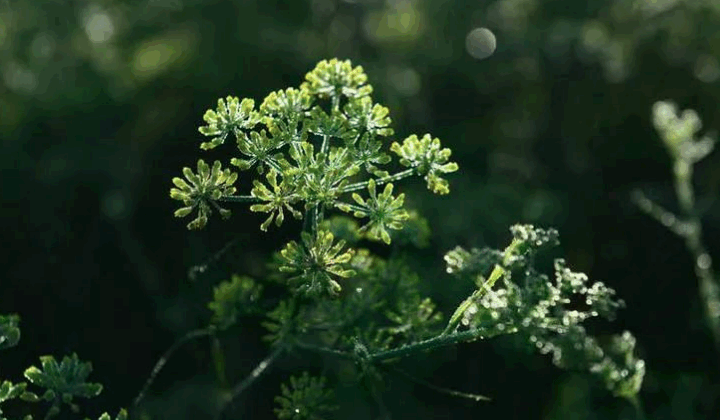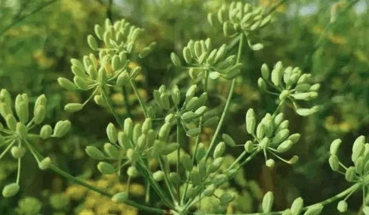 民勤茴香为伞形科茴香属植物茴香,为一年生草本植物,高0.6~2米,全株有粉霜,香气浓郁,茎分枝,直立;叶互生,2~4回羽状细裂呈丝状,长1~7厘米,宽约0.5毫米;复伞形花序,顶生,伞幅8~25个,不等长,花小,金黄色;双悬果卵状长圆形,有的稍弯曲,长4~8毫米,直径1.5~2.5毫米,表面淡黄色至黄绿色,两端略尖;分果呈长椭圆形,背面有纵棱5条,接合面平坦而较宽。千粒重6~8克,味微甜、辛,有特异香气。
