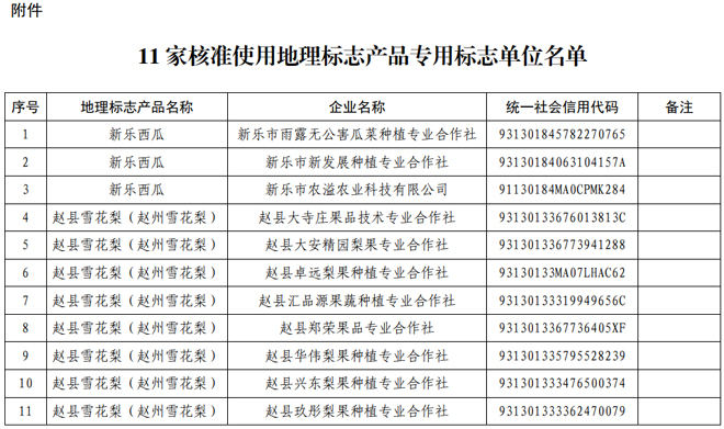根据原质检总局《地理标志产品保护规定》和国家知识产权局《地理标志专用标志使用管理办法(试行)》、《关于确定地理标志保护产品专用标志使用核准改革试点地方的通知》(国知办函保字〔2019〕1105号),按照河北省市场监督管理局《河北省地理标志保护产品专用标志使用核准工作规范(试行)》,生产新乐西瓜、赵县雪花梨(赵州雪花梨)等2个产品的11家单位(见附件),分别向产地市场监管部门提出地理标志产品专用标志使用申请,经审核合格,现予注册登记。自即日起核准上述单位在其生产的地理标志产品上使用地理标志产品专用标志,获得地理标志产品保护。