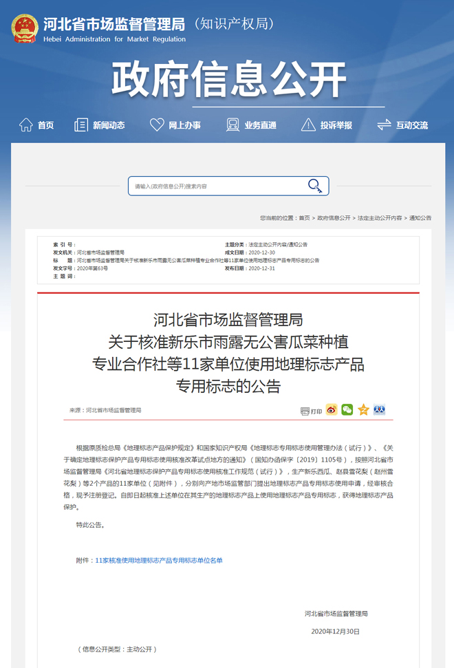 2020年12月31日,河北省知识产权局发布了关于核准新乐市雨露无公害瓜菜种植专业合作社等11家单位使用地理标志产品专用标志的公告2020年第63号。