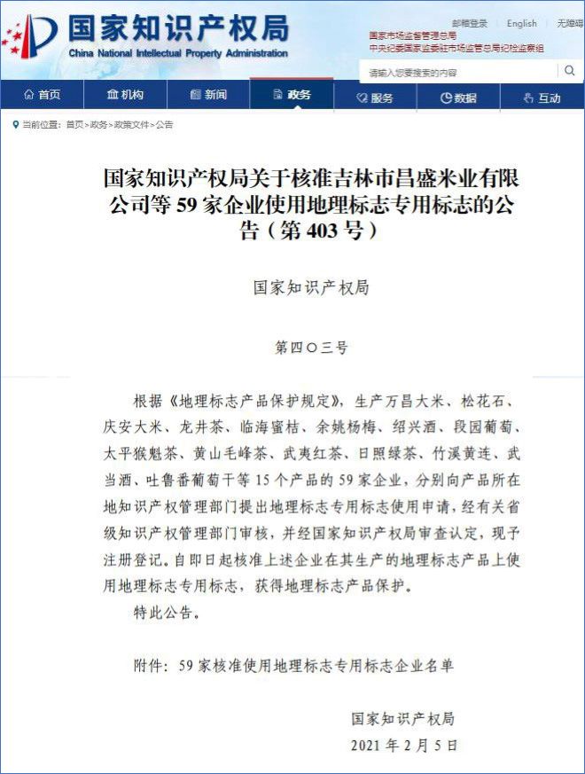 2021年2月8日,国家知识产权局发布了关于核准吉林市昌盛米业有限公司等59家企业使用地理标志专用标志的公告(第403号)。