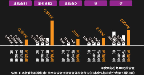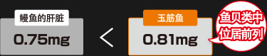鳗鱼的肝脏因富含能使人体滋养强壮的营养元素维他命B2而有名。但是据日本教育部科学技术•学术审议会资源调查分科会报告《日本食品标准成分表第五增订版》材料介绍:玉筋鱼可食用部分每100g中含有维他命B1 0.19mg、维他命B2 0.81 mg、维他命D 21ug(图1);鳗鱼的肝脏仅含维他命B2 0.75 mg,玉筋鱼的维他命B2含量要比鳗鱼的肝脏更丰富,因此食用玉筋鱼比食用鳗鱼的肝脏更能让人充满活力(图2)。同时,在对酒精的分解起到关键作用的维生素B群的含量上玉筋鱼格外的丰富,是有益于肝脏健康的蚬贝的6倍。