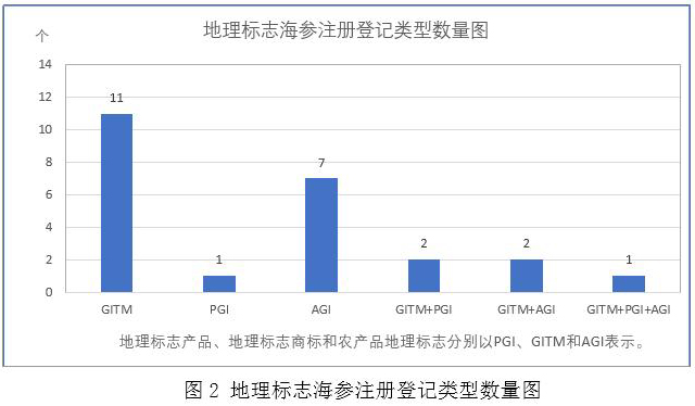 两种类型注册登记的数量有4个,占总数的16.67%;其中,注册登记为地理标志商标与地理标志产品(GITM+PGI)的有2个;注册登记为地理标志商标与农产品地理标志(GITM+AGI)的有2个。