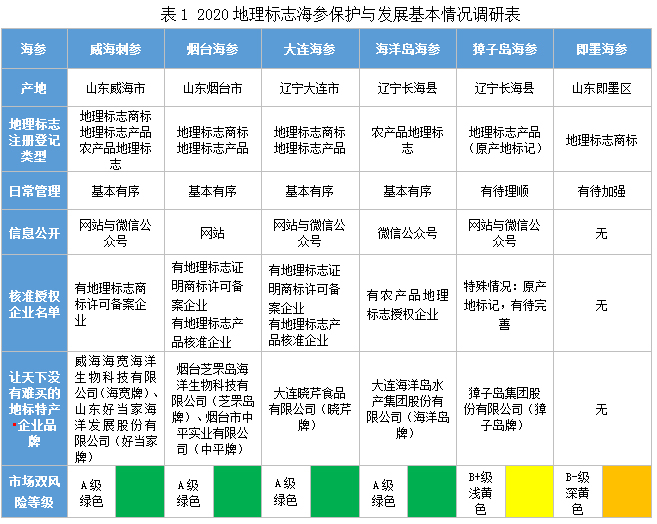 依据《地理标志双风险等级划分规范》,经对地理标志海参日常管理、核准授权和信息公开等基本情况调研,威海刺参、烟台海参、大连海参、海洋岛海参等四个地理标志市场双风险等级为A级(绿色);獐子岛海参的市场双风险等级为B+级(浅黄色);即墨海参的市场双风险等级为B-级(深黄色)。