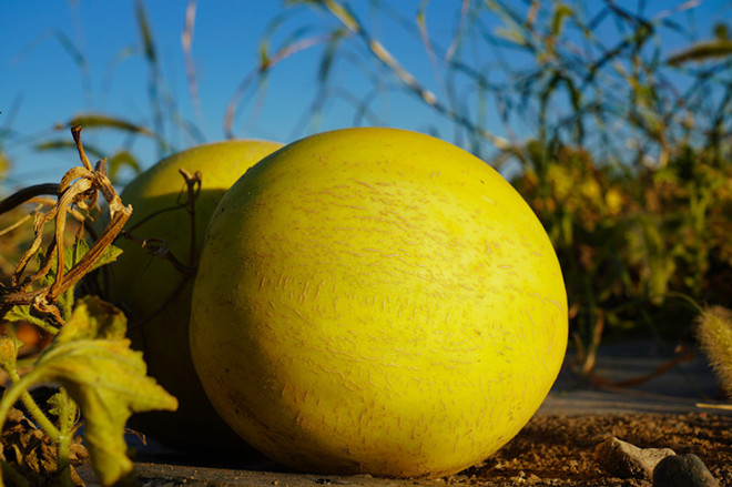 (1)外在感官特征:成熟的白兰瓜呈圆球形,个头均匀,外形美观;皮色白中泛黄,果皮平滑,有纵沟纹或斑纹,无刺状突起;瓜肉淡绿且呈半透明状,宛如翡翠(间或也有杏黄色),肉厚细嫩,瓜味甘甜、汁液丰富、香气浓郁、芳醇爽口;果皮厚有韧性,适宜长途运输和贮藏。
