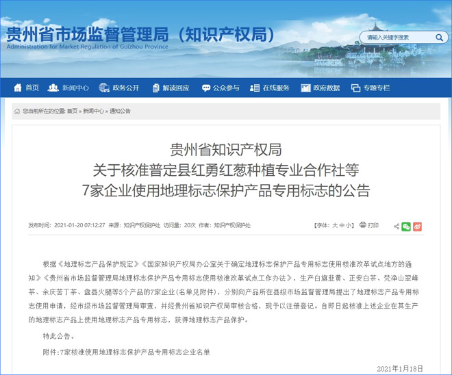 2021年1月20日,贵州省知识产权局发布了关于核准普定县红勇红葱种植专业合作社等7家企业使用地理标志保护产品专用标志的公告。