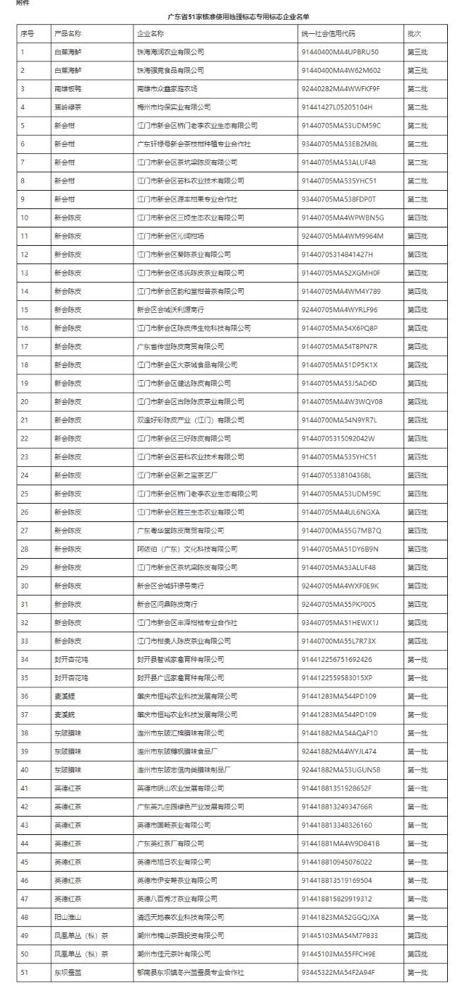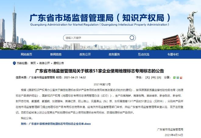 2021年4月21日,广东省市场监督管理局发布了关于核准51家企业使用地理标志专用标志的公告2021年第12号。