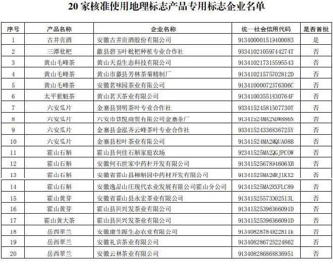 根据《地理标志产品保护规定》《地理标志专用标志使用管理办法(试行)》《国家知识产权局办公室关于确定地理标志保护产品专用标志使用核准改革试点地方的通知》《安徽省地理标志保护产品专用标志使用管理办法(试行)》等要求,生产古井贡酒、太平猴魁茶、黄山毛峰茶、三潭枇杷、六安瓜片、霍山石斛、霍山黄芽、霍山黄大茶、岳西翠兰等 9 个产品的 20 家企业(名单见附件),分别向产品所在地市场监管部门提出了地理标志产品专用标志使用申请,经有关设区市市场监管部门审核,并经我局审查合格,现予以注册登记。自即日起核准上述企业在其生产的地理标志产品上使用地理标志产品专用标志,获得地理标志产品保护。