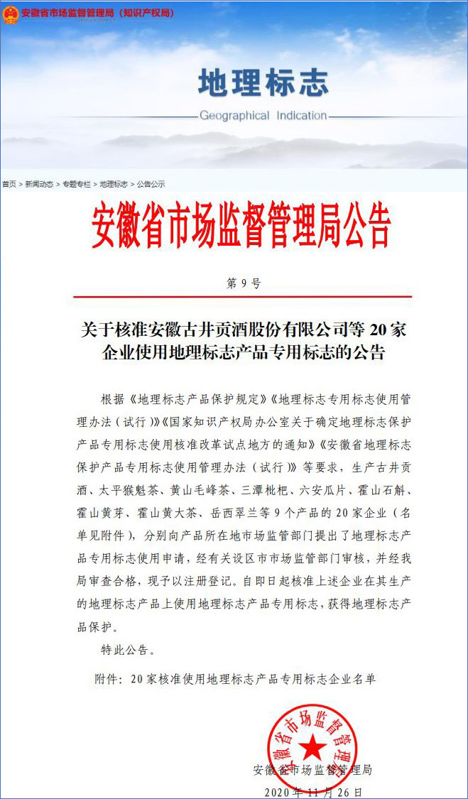 2020年11月26日,安徽省市场监督管理局发布了 《关于核准安徽古井贡酒股份有限公司等20家企业使用地理标志产品专用标志的公告(第9号)》。