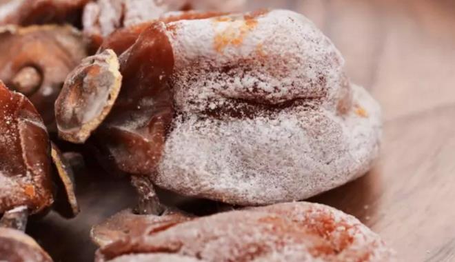 6.回软潮霜:将晒好的无霜饼装入干净容器中苫盖,置于阴凉的室内,经4至5天,柿饼回软后放置在通风阴凉处摊晾进行潮霜,产品即“霜饼”。